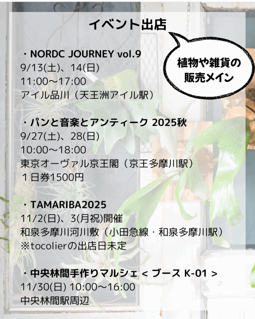 どちらのイベントも、tocolierは観葉植物メインで出店します。