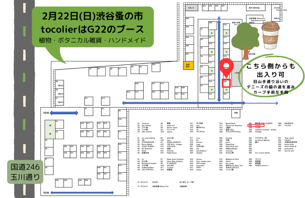 交差点方面から行くとtocolierは一番奥の方の木が多いエリアでの出店です。