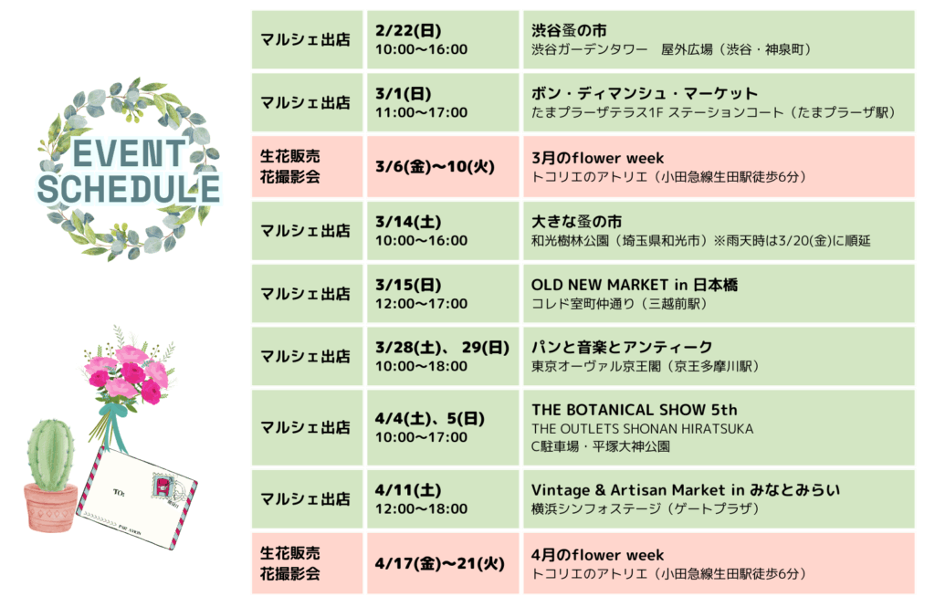 渋谷(2/22日)、たまプラーザ(3/1日)埼玉(3/14土)、日本橋(3/15日)、調布(3/28土、29日)、湘南平塚(4/4土、5日)、横浜(4/12土)に出店が決まりました。