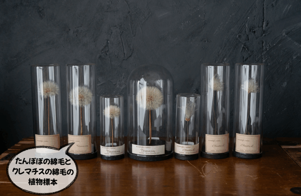 たんぽぽの綿毛の植物標本、クレマチスの綿毛の植物標本。